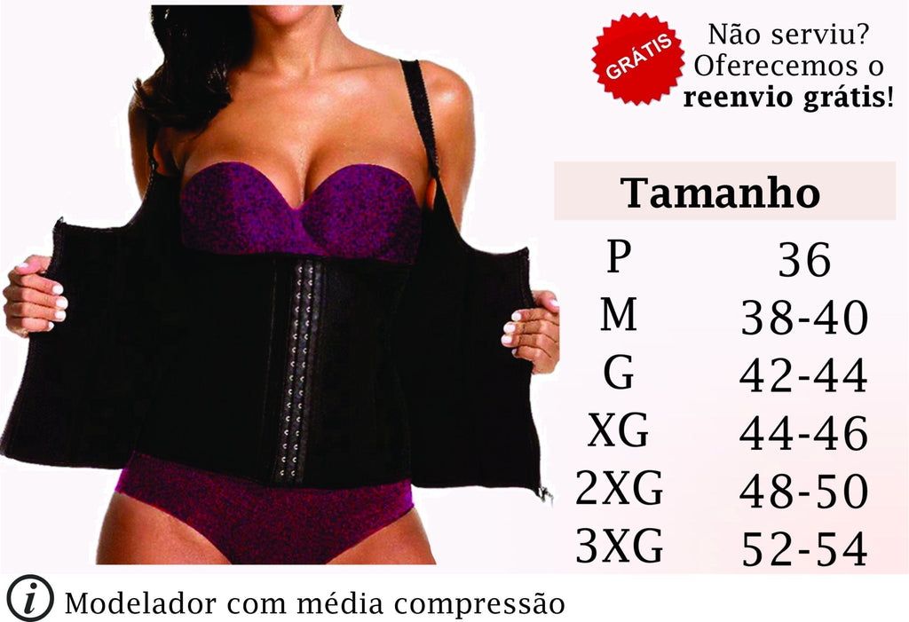 - controle de firmeza máximo e alças ajustáveis: o modelador conta com 3 colunas de fechos e 2 ajustes de alças nos ombros